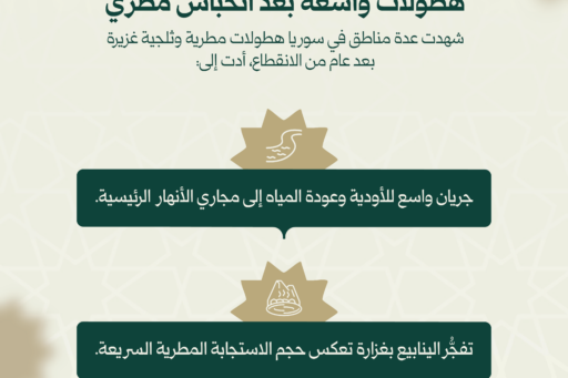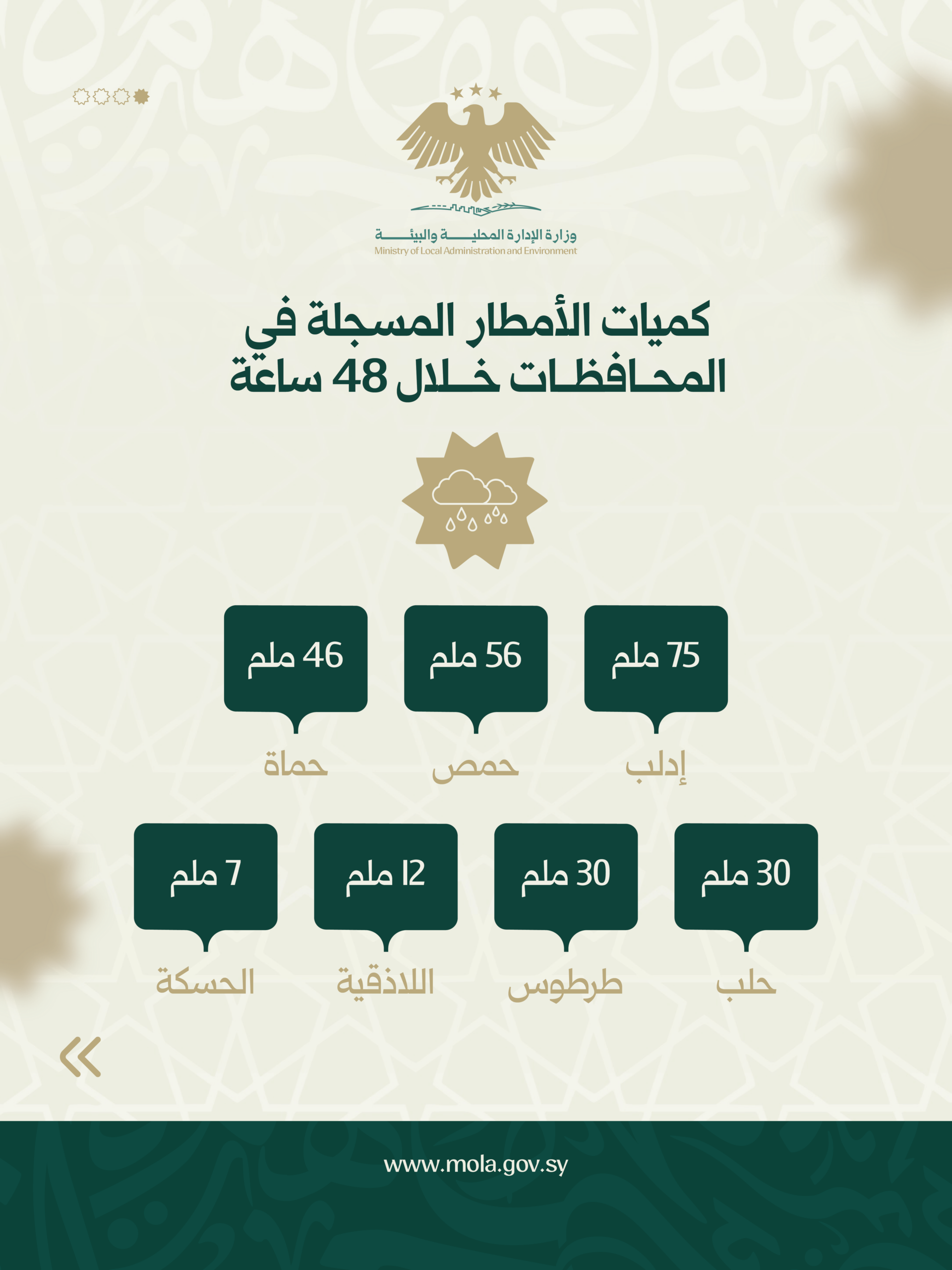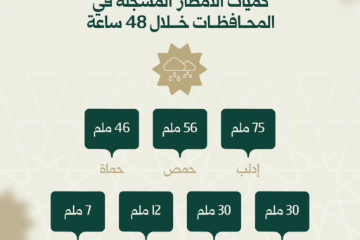وسُجلت أعلى الكميات المطرية في محافظة إدلب بلغت 75 ملم، تليها حمص بـ56 ملم، وحماه 46 ملم. بينما سجلت حلب وطرطوس 30 ملم لكل منهما، واللاذقية 12 ملم، والحسكة 7 ملم.
