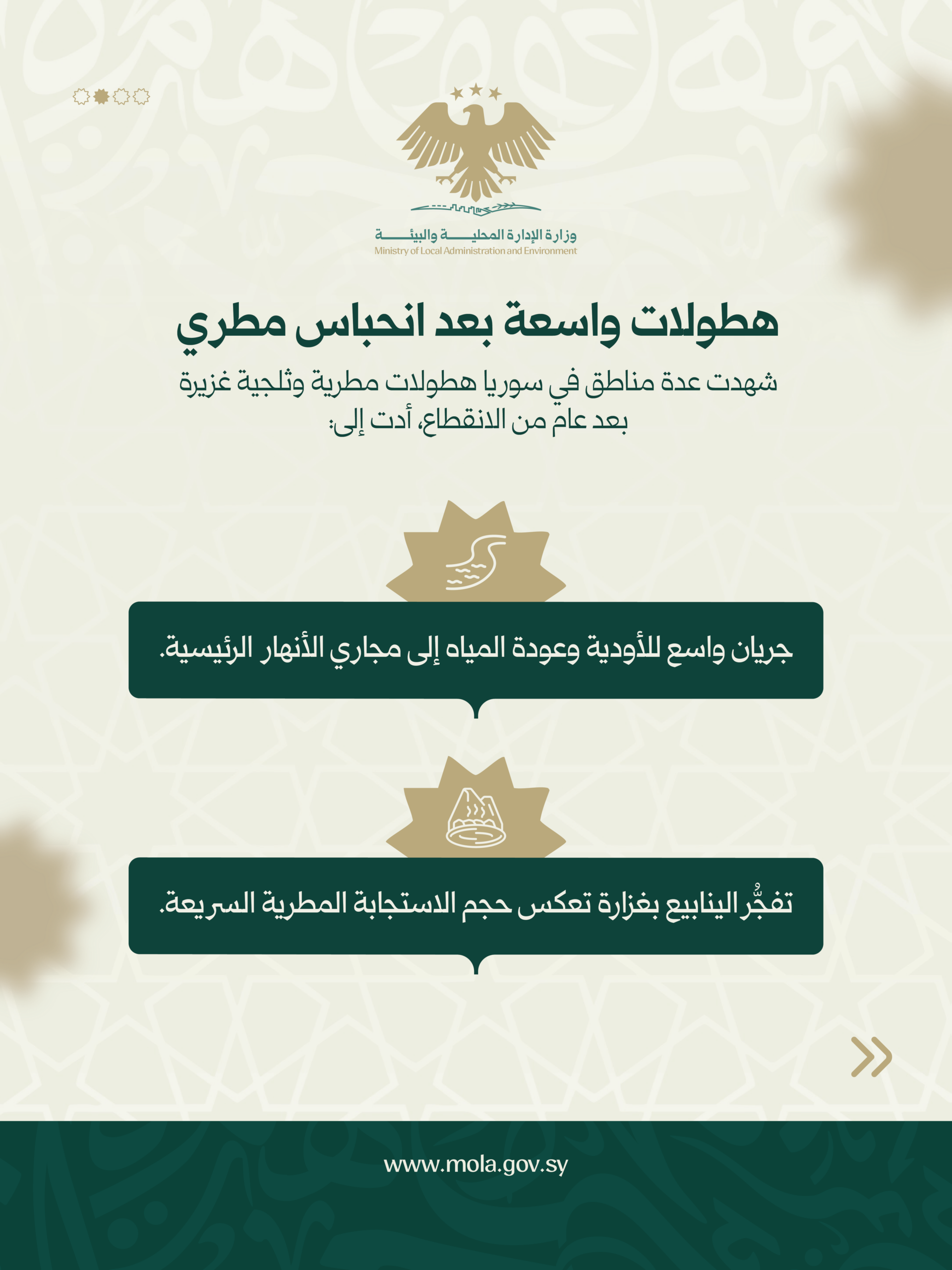 وأدت الأمطار الغزيرة إلى جريان العديد من الأودية وعودة المياه إلى مجاري الأنهار، كما تفجرت الينابيع بغزارة واضحة، ويتوقع أن تمد هذه التدفقات أحواض المياه السطحية بمخزون يعوض جزءاً من العجز، وسيظهر أثرها من خلال ارتفاع منسوب المياه في الآبار السطحية في الأيام القادمة