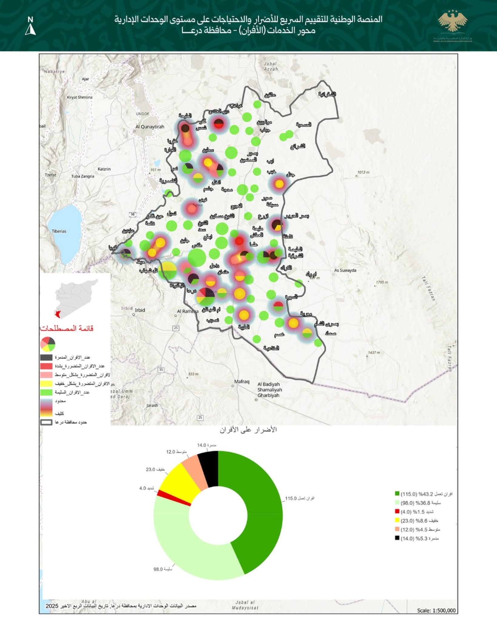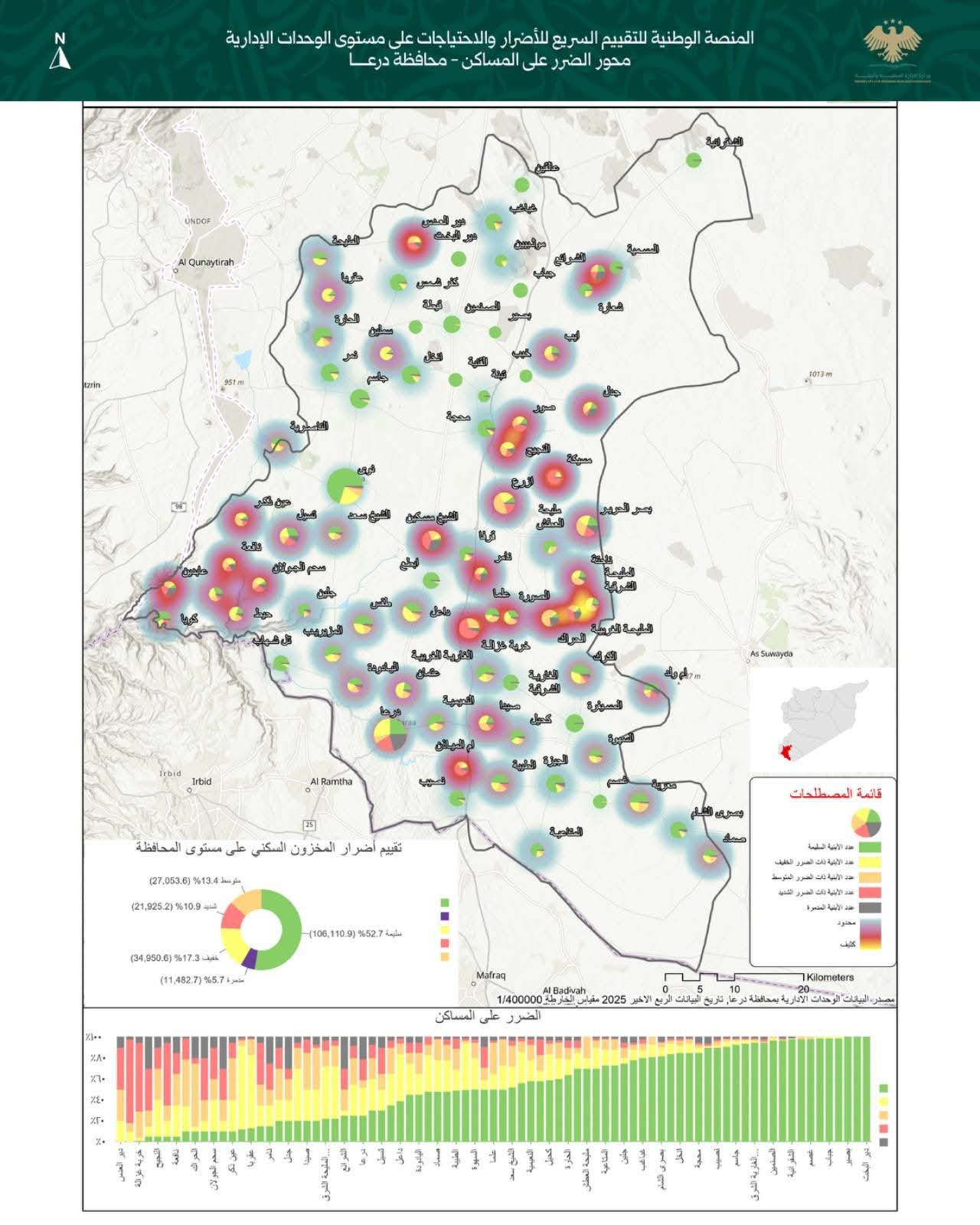 وفي سياق هذه الجهود تم إنجاز التقرير الخاص بمحافظة درعا والذي كشف عن حجم التحديات التي تواجه المحافظة الجنوبية، حيث أظهرت البيانات تضرر أكثر من 95 ألف منزل ووحدة سكنية منها 33400 منزل مدمر وأكثر من 60 ألف منزل متفاوت الضرر كما رصد التقرير أكثر من 55 فرناً بأضرار متفاوتة.