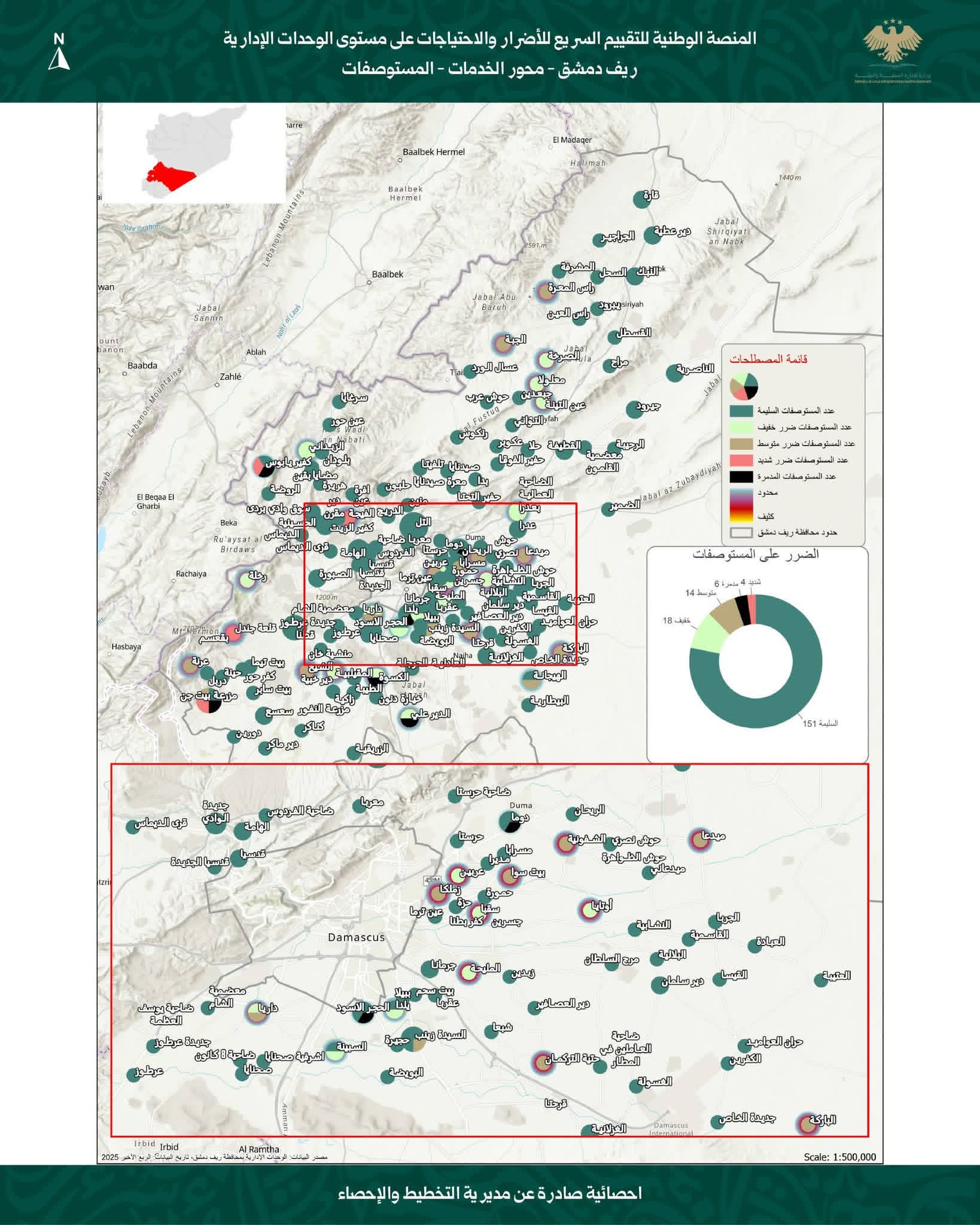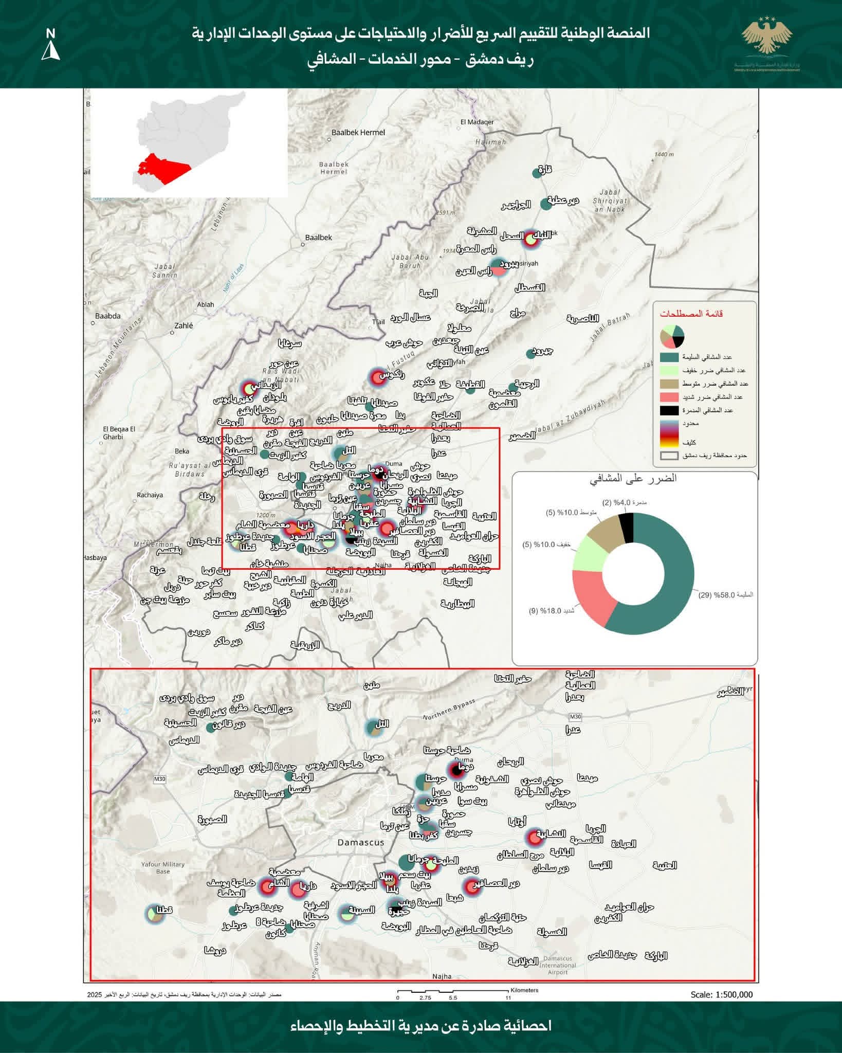 أصدرت وزارة الإدارة المحلية والبيئة، بالتعاون مع برنامج الأمم المتحدة للمستوطنات البشرية (UN-Habitat)، نتائج دراسة تقييم الأضرار والاحتياجات في محافظة ريف دمشق، استناداً إلى بيانات الربع الأخير من عام 2025.