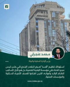 وزير الإدارة المحلية والبيئة المهندس “محمد عنجراني”: “استهداف تنظيم “قسد” لمبنى القصر البلدي في حلب ليس مجرد اعتداء على مؤسسة بلدية خدمية، بل هو تكرار لأساليب النظام البائد وأعوانه، الذين اعتادوا قصف الأحياء السكنية والمؤسسات المدنية”.