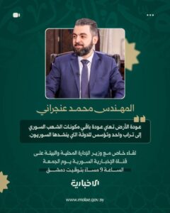 المهندس “محمد عنجراني”: رؤيتنا في الوزارة تنطلق من تمكين المجتمعات المحلية من إدارة شؤونها، وعودة الأرض تعني عودة باقي مكونات الشعب السوري إلى تراب واحد وتؤسس للدولة التي ينشدها السوريون.