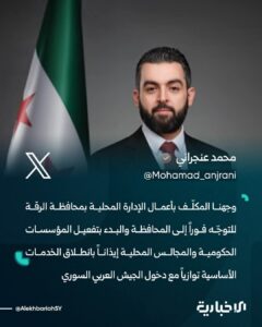 – وجهنا المكلّف بأعمال الإدارة المحلية في محافظة الرقة للتوجّه فوراً إلى المحافظة والبدء بتفعيل المؤسسات الحكومية والمجالس المحلية إيذاناً بانطلاق الخدمات الأساسية توازياً مع دخول الجيش العربي السوري.