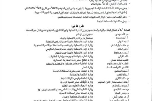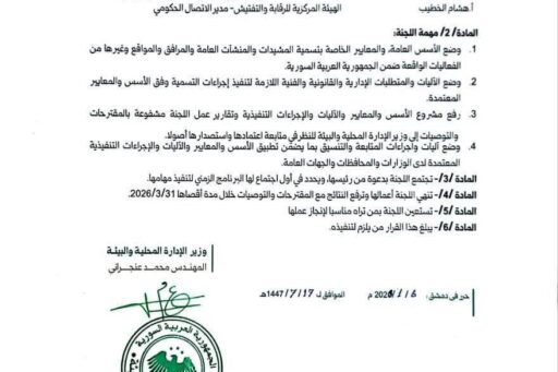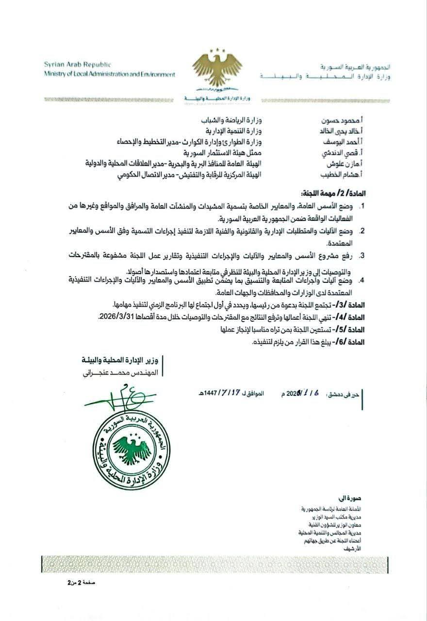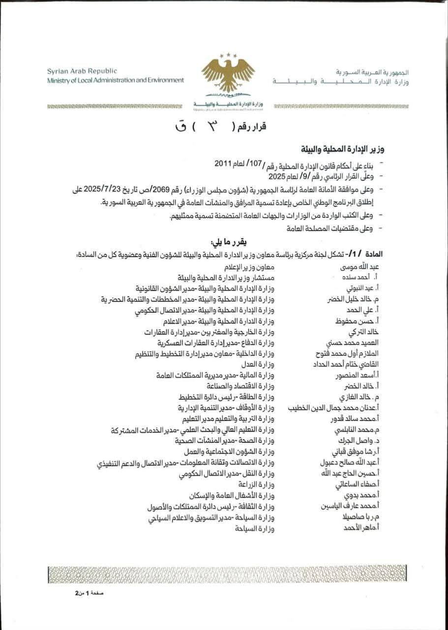 وزير الإدارة المحلية والبيئة المهندس “محمد عنجراني”يصدر قراراً بتشكيل لجنة مركزية برئاسة معاون وزير الإدارة المحلية والبيئة للشؤون الفنية، لإعادة تسمية المرافق والمنشآت العامة، تضم ممثلين عن جميع الوزارات والهيئات الحكومية المعنية.